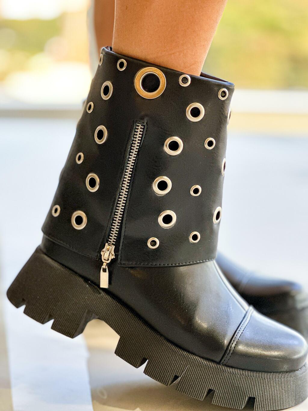 Conheça o Coturno Ilios, um modelo sem cadarço que se destaca pelo seu acabamento elegante com zíper na cor preta. Com um cano curto de 15 cm, ele é todo decorado com ilhós prata, trazendo um charme irresistível.